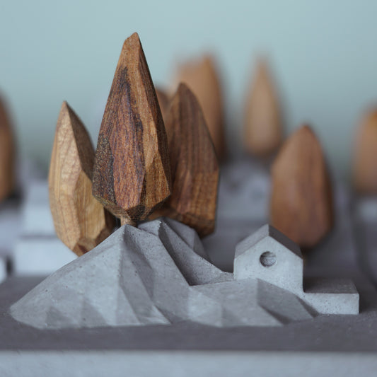are escapist sceneries, handmade in concrete and plain wood, to hang on the wall, or lay wherever you wish.