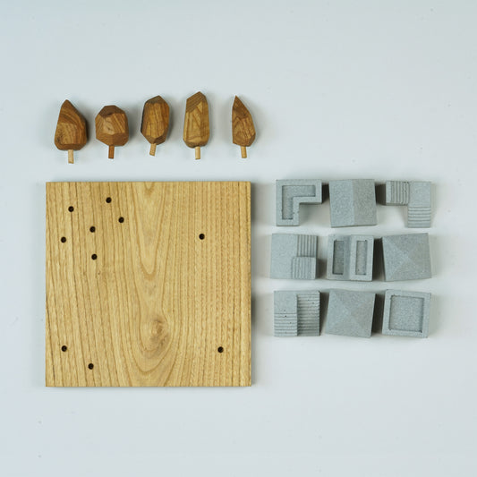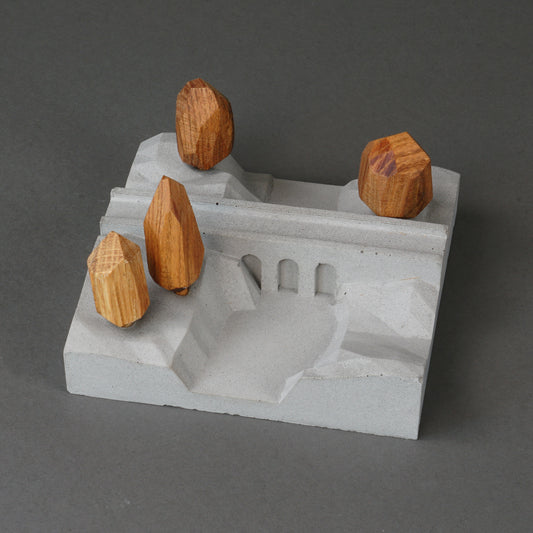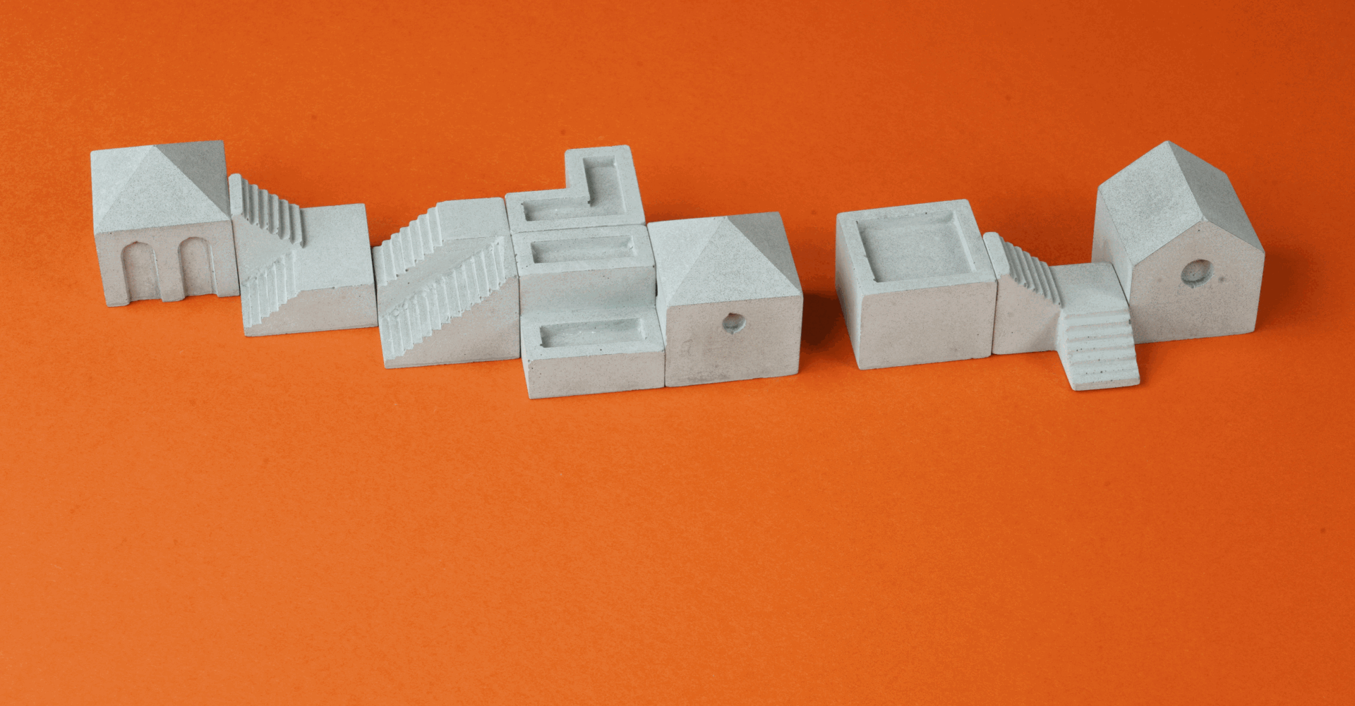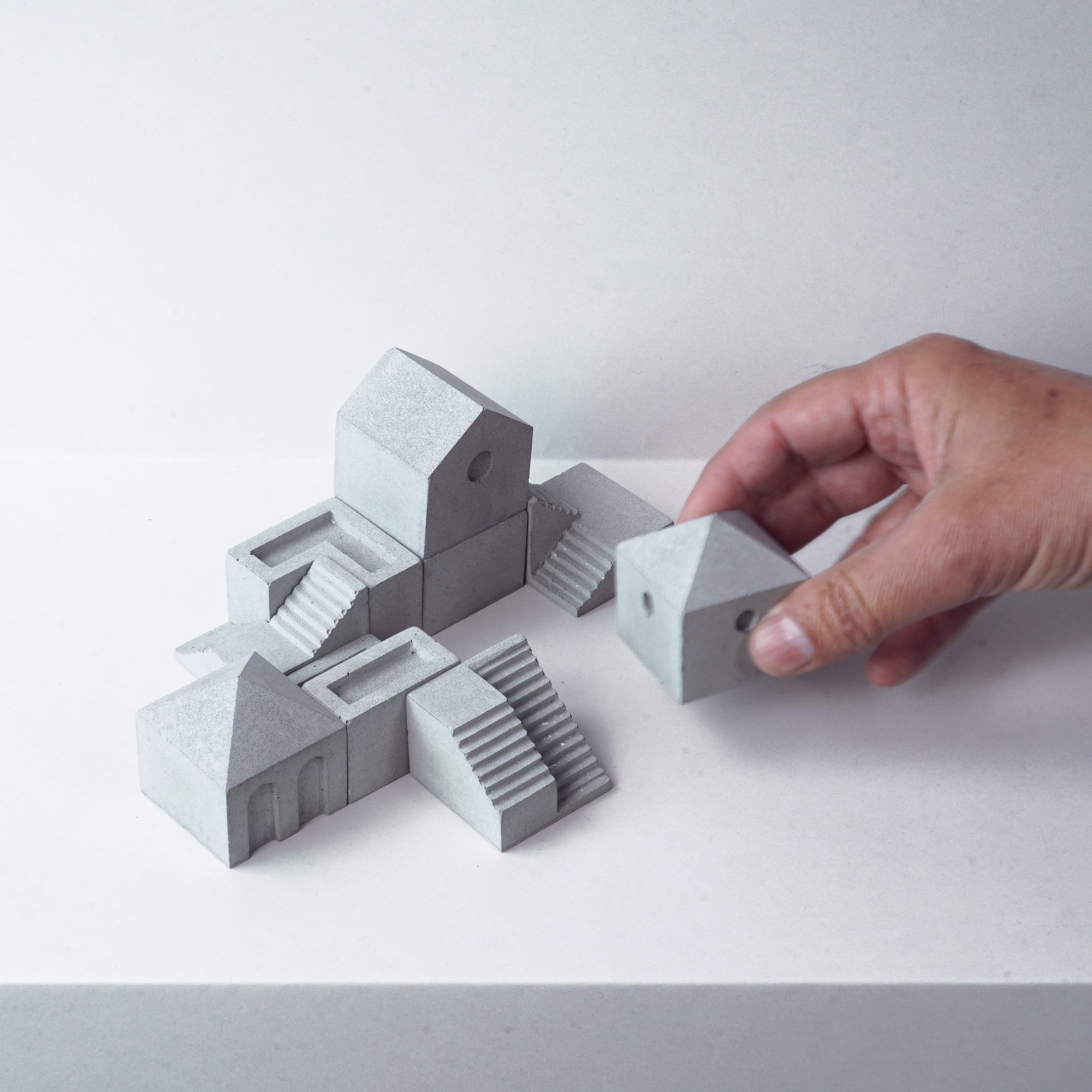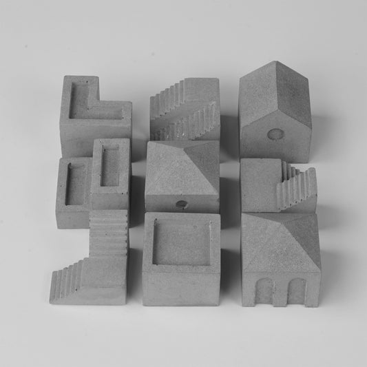 is a set of 9 4x4x4 cms blocks, handmade in concrete. To play with forms and structures, to inspire and create! These modular concrete forms serve as the building blocks of architectural imagination, to create space, light, shadow. To evoke moods and atmospheres.