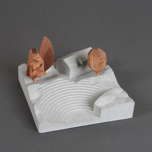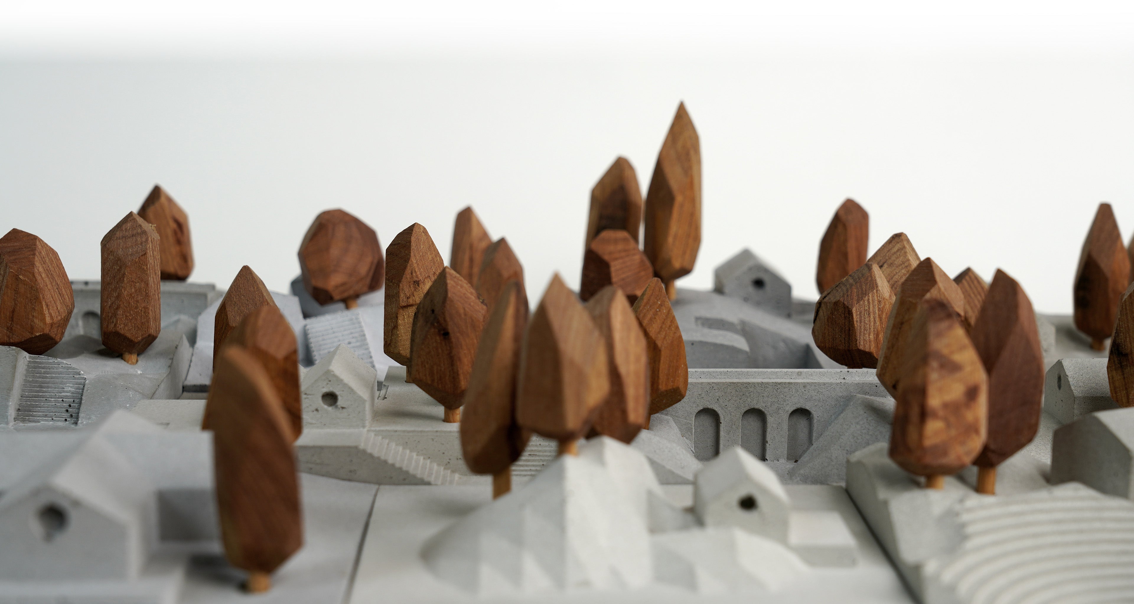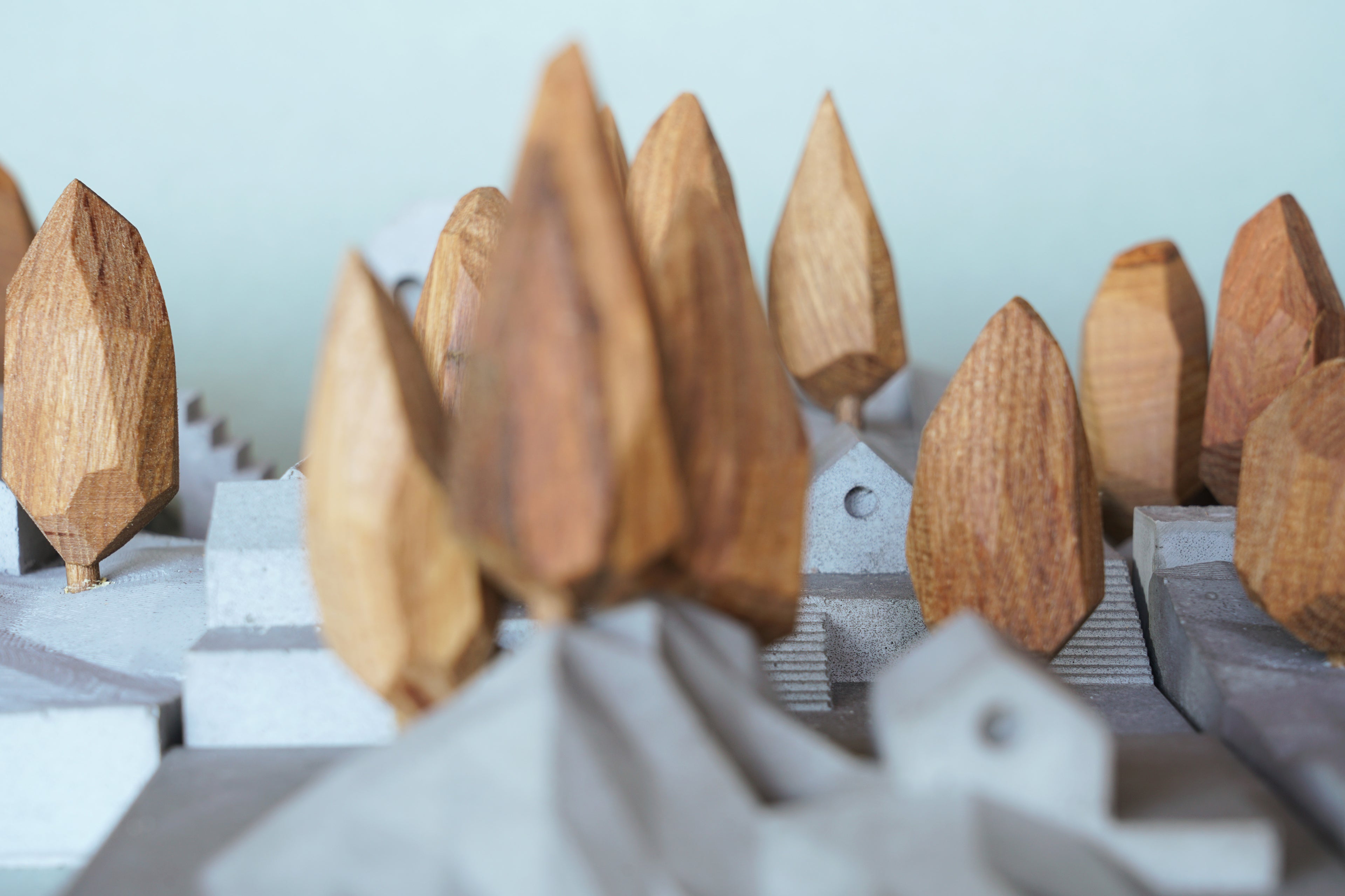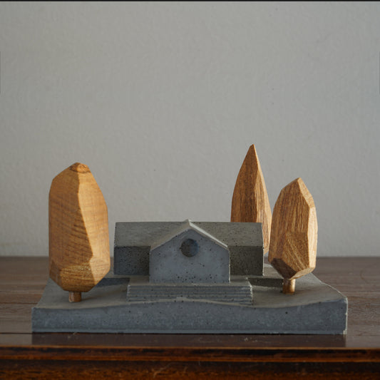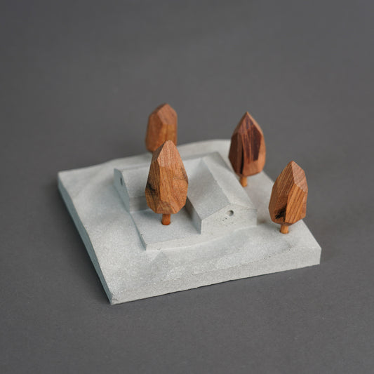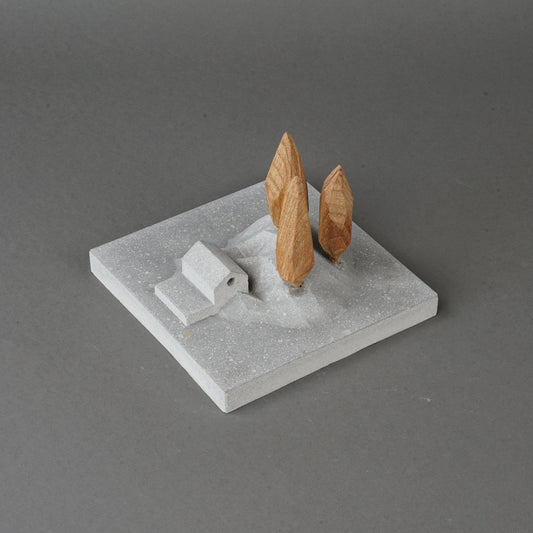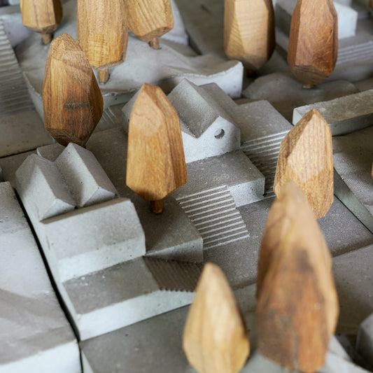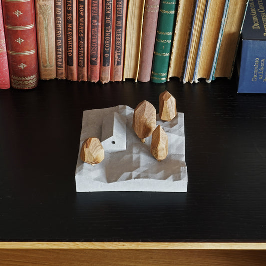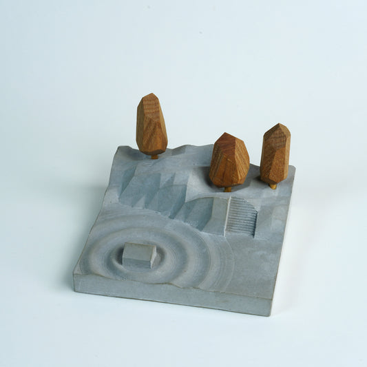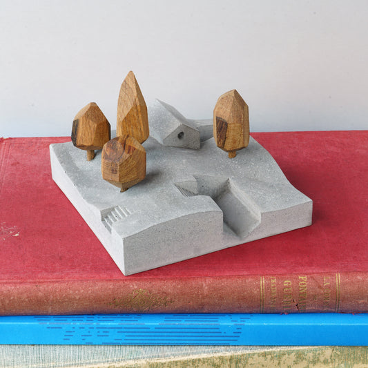 are small escapist sceneries, handmade in concrete and plain wood, to hang on the wall, or lay wherever you wish. / Wander through the rolling hills, feel the wind, the trees or stop by the mini rivers.